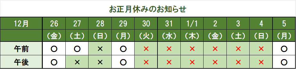 12月30日(火)から1月4日(日)までお正月休みの為、休診とさせていただきます。